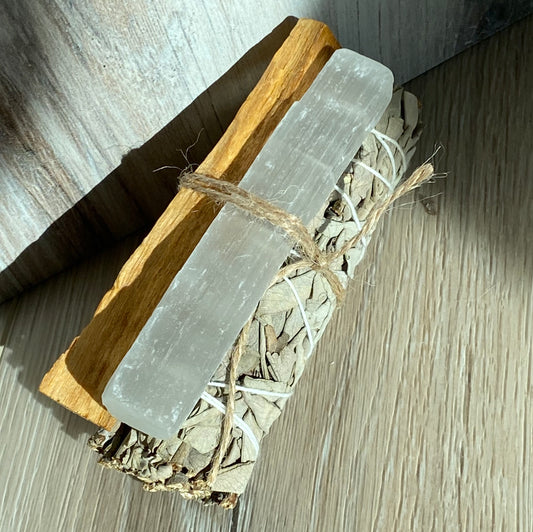 Energy Clearing Bundle [Sage (white sage or eucalyptus sage), Palo Santo + Selenite Wand]