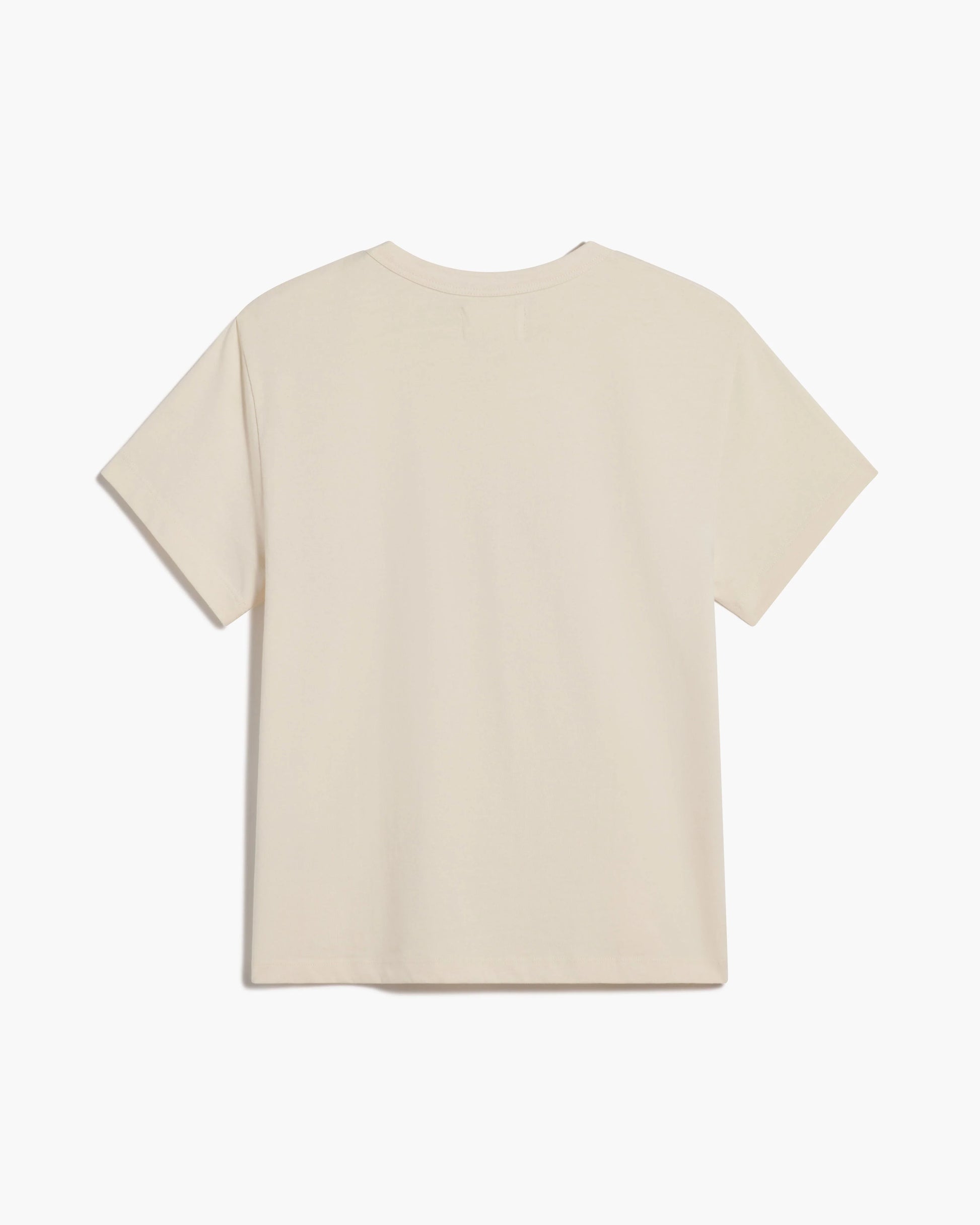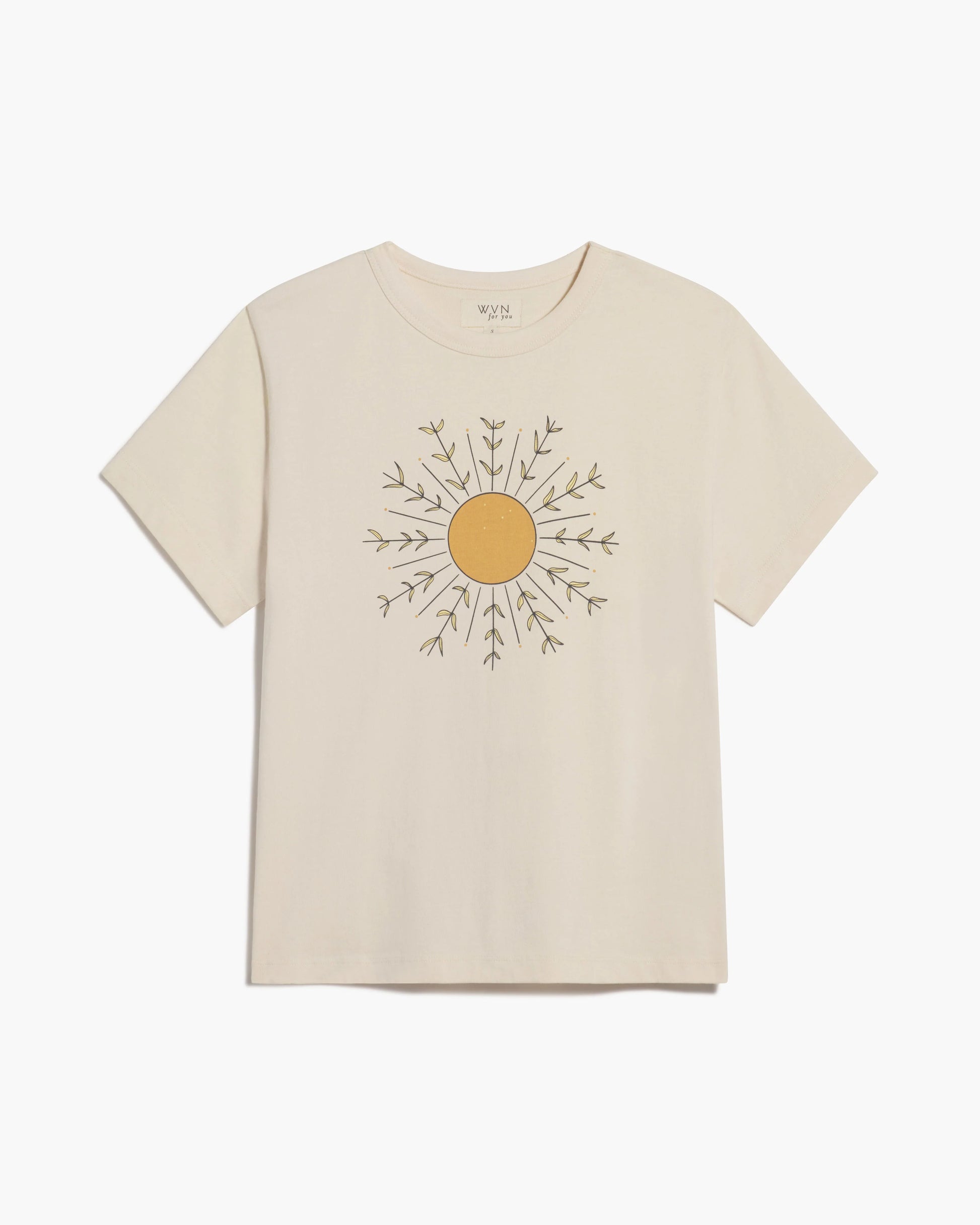 The Afterglow Tee features graphic art by Sun Keep. Made with natural, off-white organic cotton and low impact dyes, radiate organic goodness and shine like the sun in this top. Easy-fitting cropped tee with a classic cool fit.