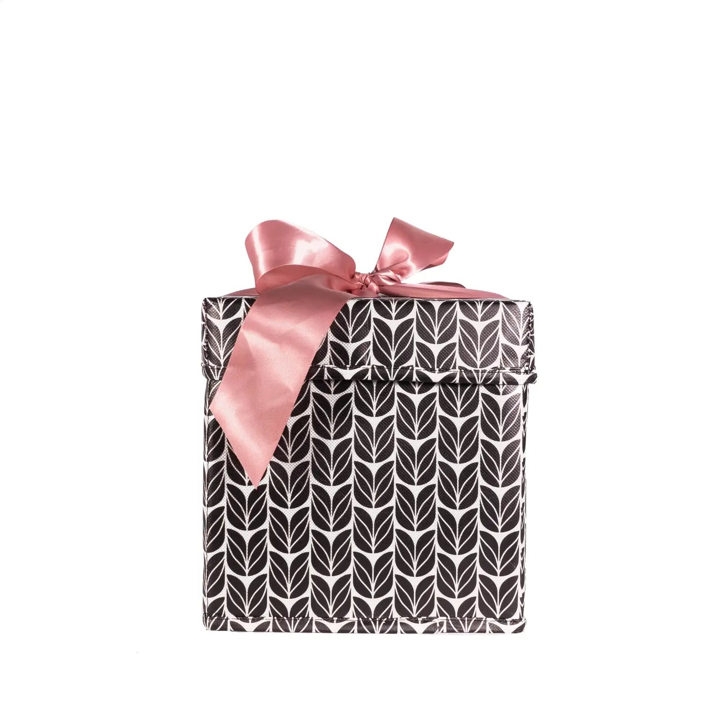 Small 8" black and white tulip floral collapsible gift box with satin ribbon attached makes a great zero waste solution for sustainable and eco-friendly gift boxes