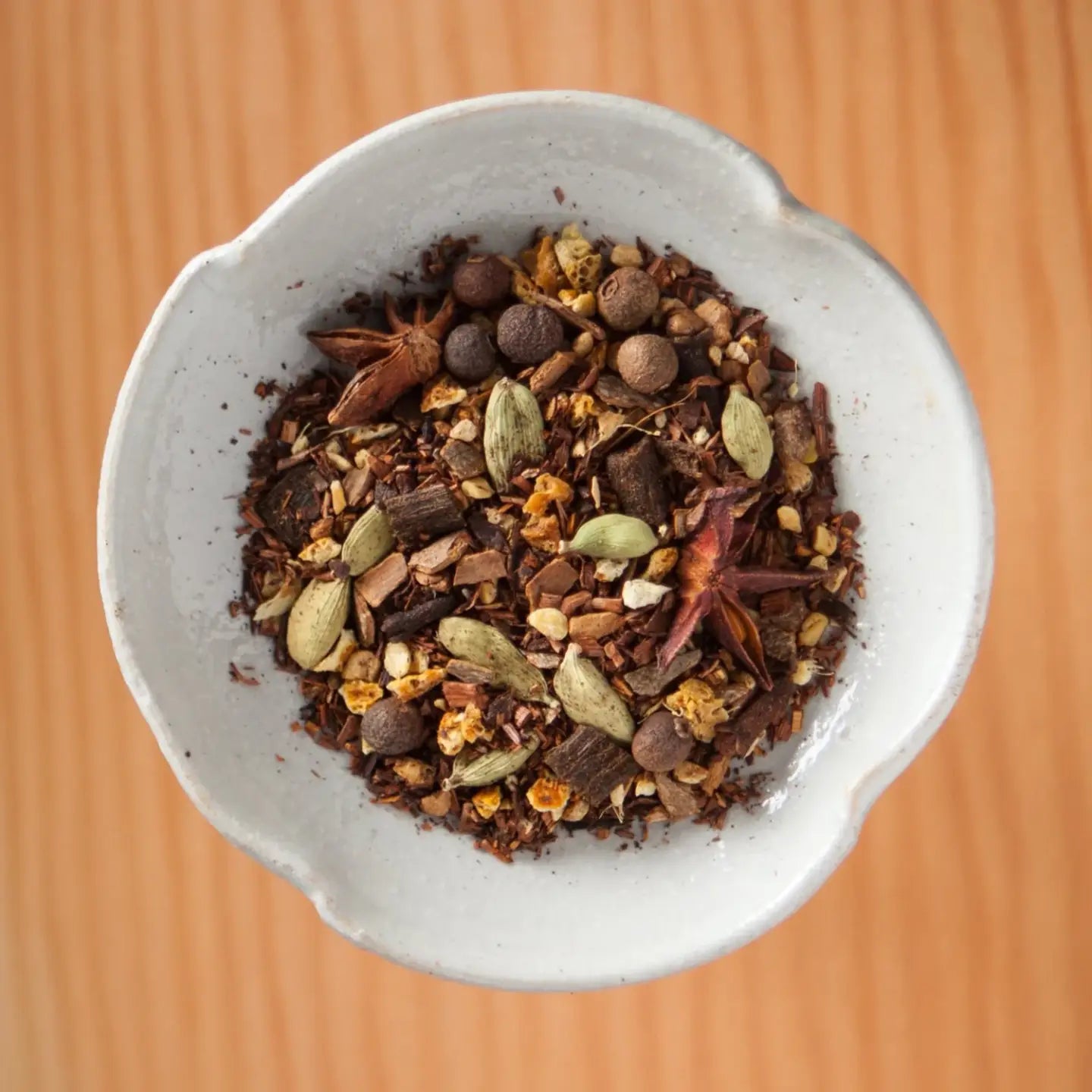 Chai spices rounded to perfection with African red tea, vanilla bean and a touch of citrus.