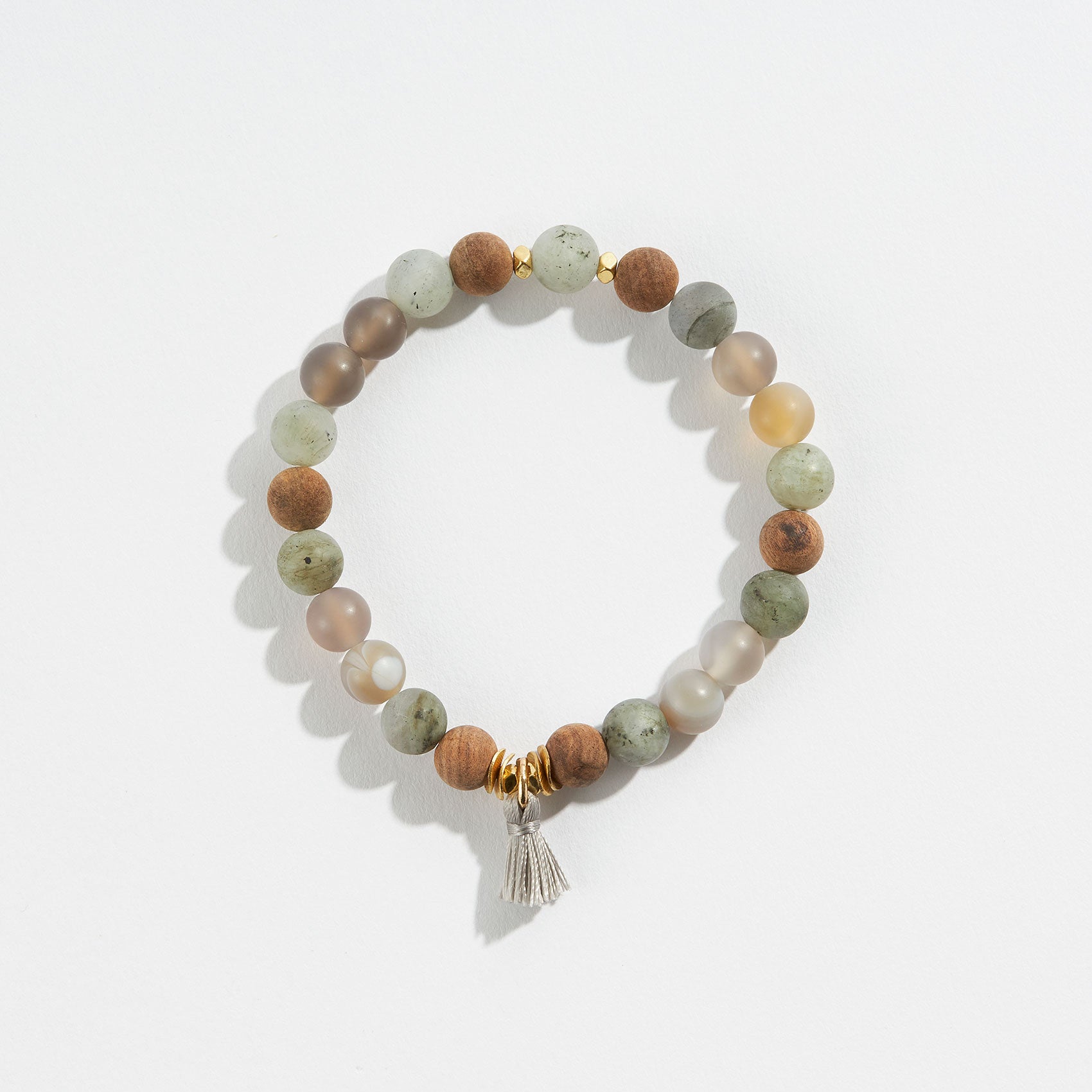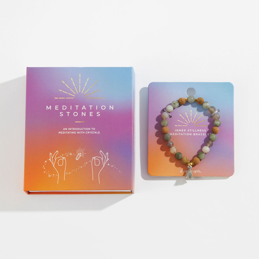 The Inner Stillness Crystal Meditation Bracelet includes natural crystal + wood beads curated to support a calm, quiet mind and an open heart. Beads are strung on an elastic strand to fit a variety of wrist sizes with ease.
