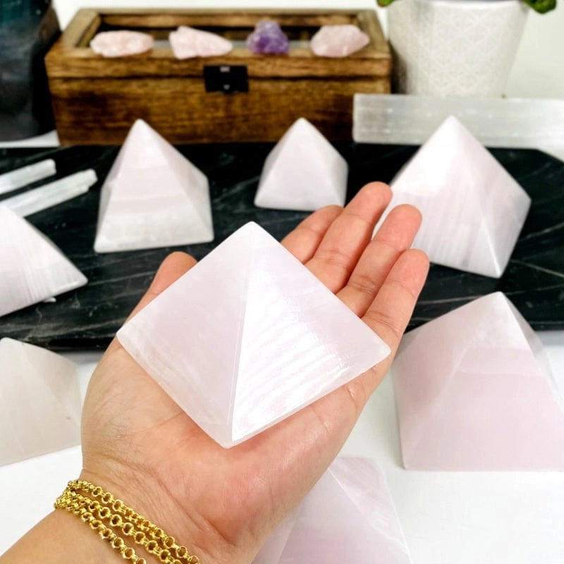 Stunning pink Mangano calcite pyramids that have been polished to a fine polish. These pyramids have a amazing pink color to them with some having white stripes. The sizing and shape of these pyramids are perfect to add to any décor to give it more of a celestial and bright feeling. These pyramids would make as a great gift to any crystal or mineral collector. These are UV Reactive due to the Manganese content and glow a bright orange-pink color under UV light.