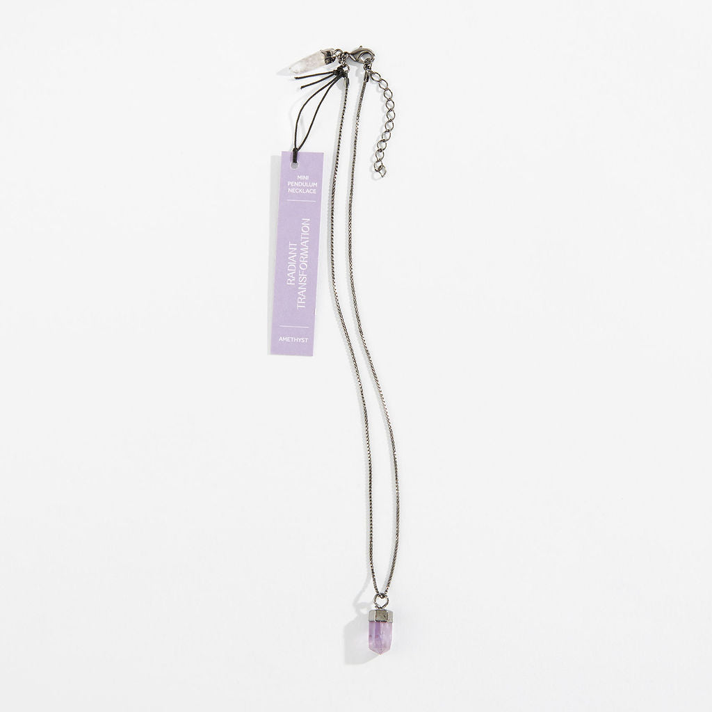 Our Mini Pendulum Necklace complements our classic larger crystal pendulum – both products can be used for dowsing and divination practices. This necklace features a main amethyst point as the mini pendulum and a decorative, dainty clear quartz point at back clasp. Both crystals and box chain are flash plated in pewter colored metal.