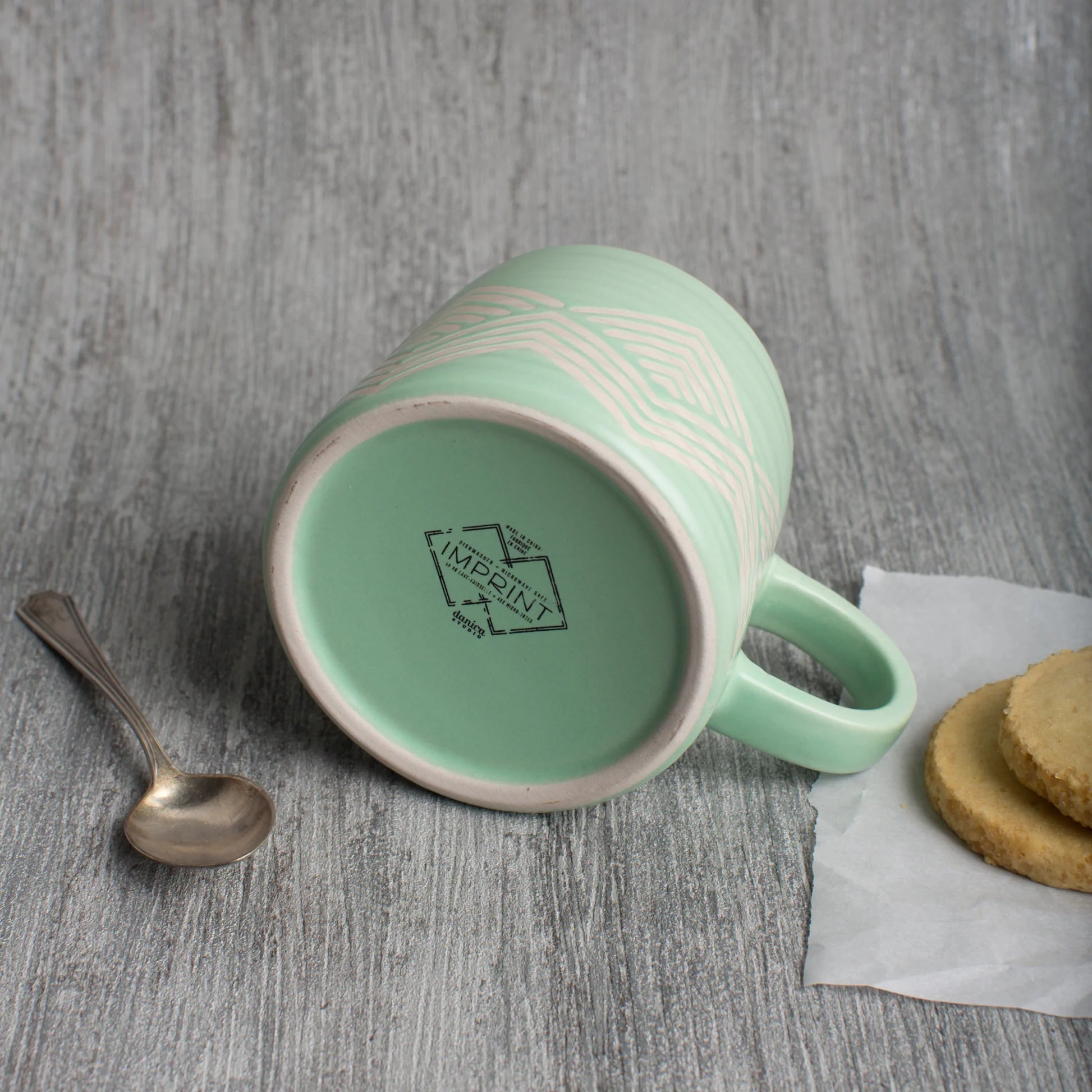 Elevate enjoyment of your favorite beverages with our Mint Imprint Mug. The wave-like lines and soft white and mint palette give this stoneware mug a calm look and feel for mellow mornings.