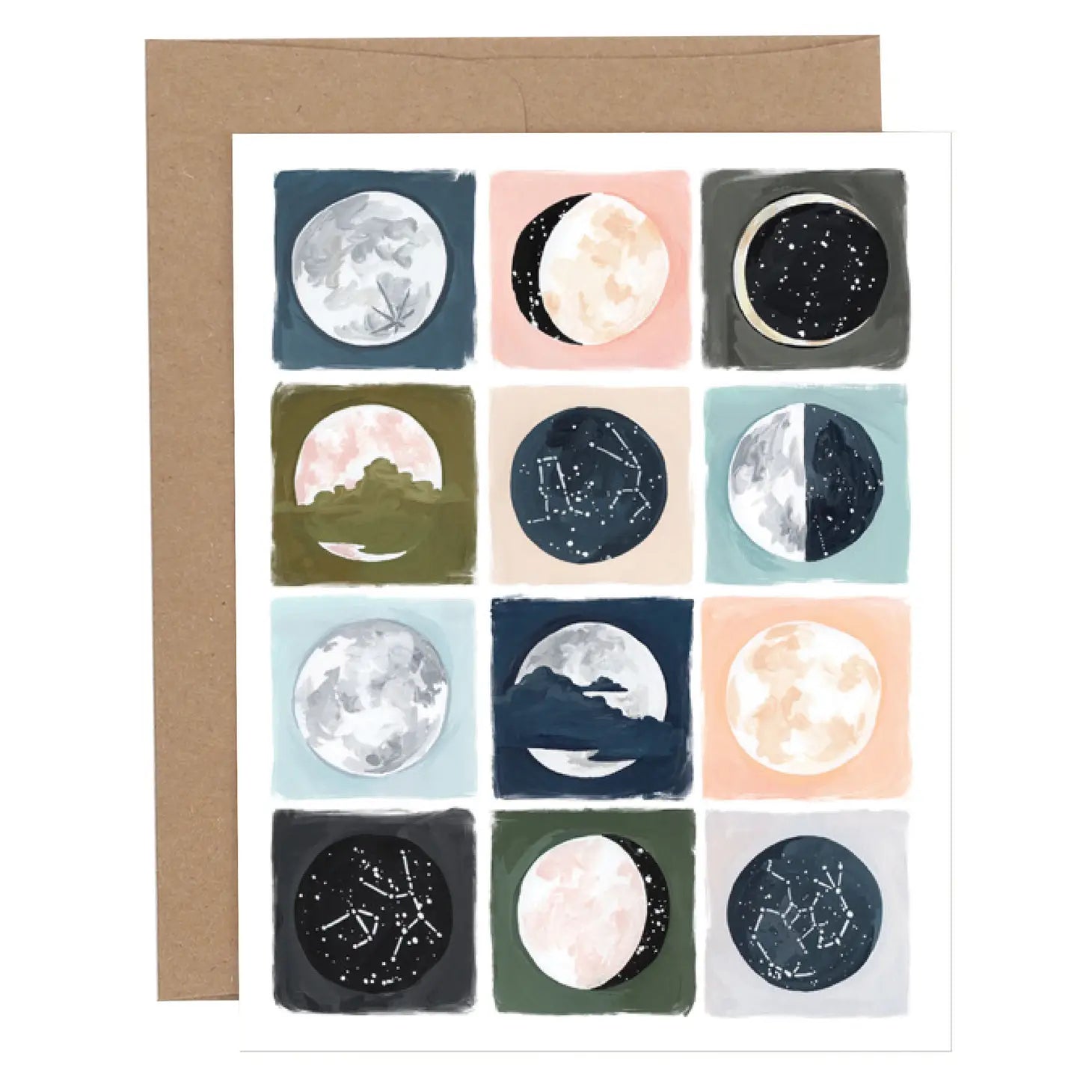 A beautiful hand drawn card with different moons-- for everyday notes & sentiments.