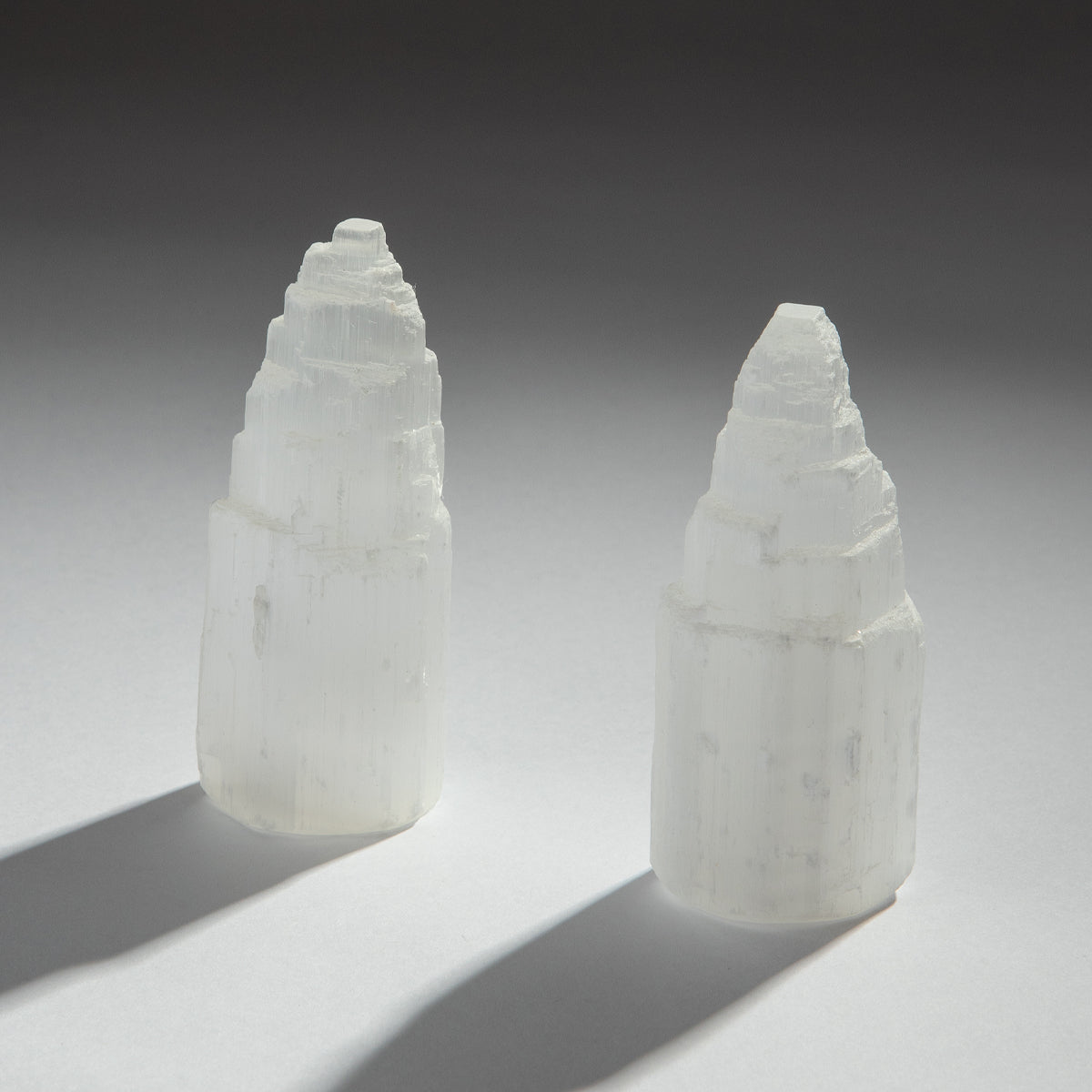 Beautiful milky white/clear selenite shaped into cylindrical towers are freestanding and make a beautiful addition to your crystal collection. Selenite has many useful properties, making it a staple to your crystal collection and home/space.