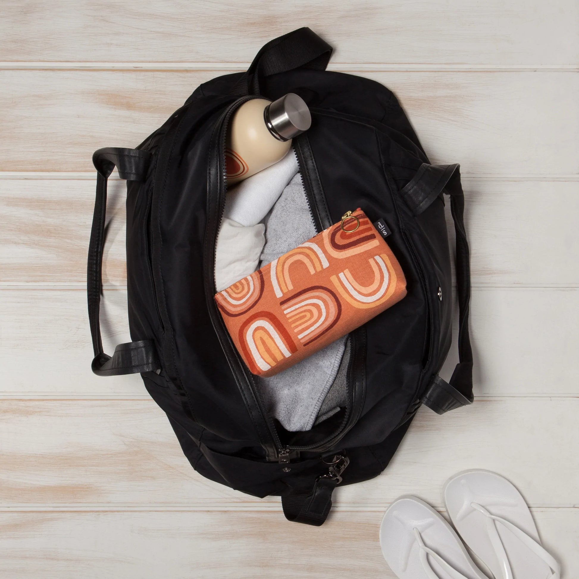 Organization comes naturally with our Solstice Pencil Cosmetic Bag. Adorned with a painterly mix of terracotta rainbows, this small pouch corrals pens, brushes, ear buds and cords for work or crafts on the go.