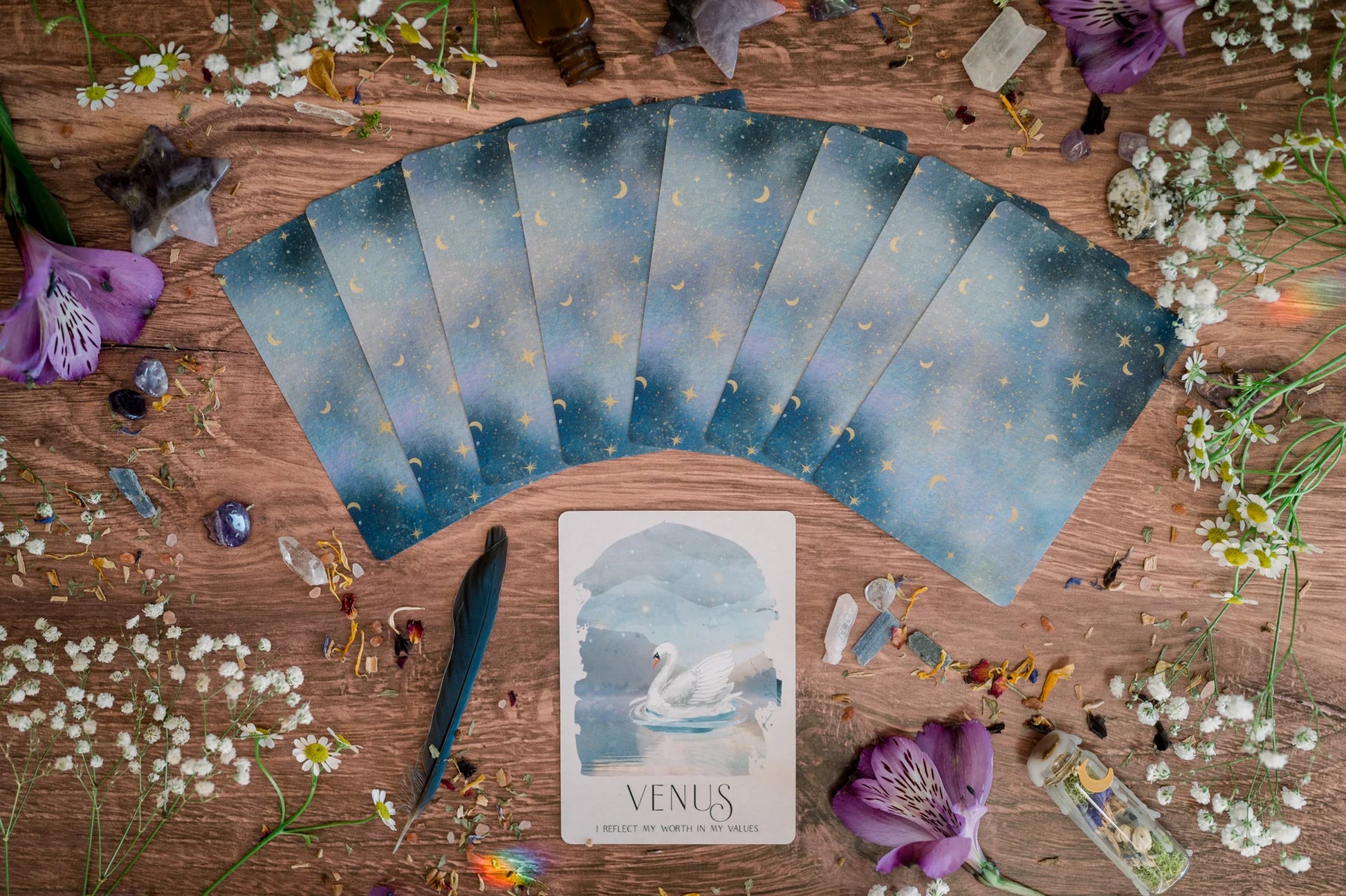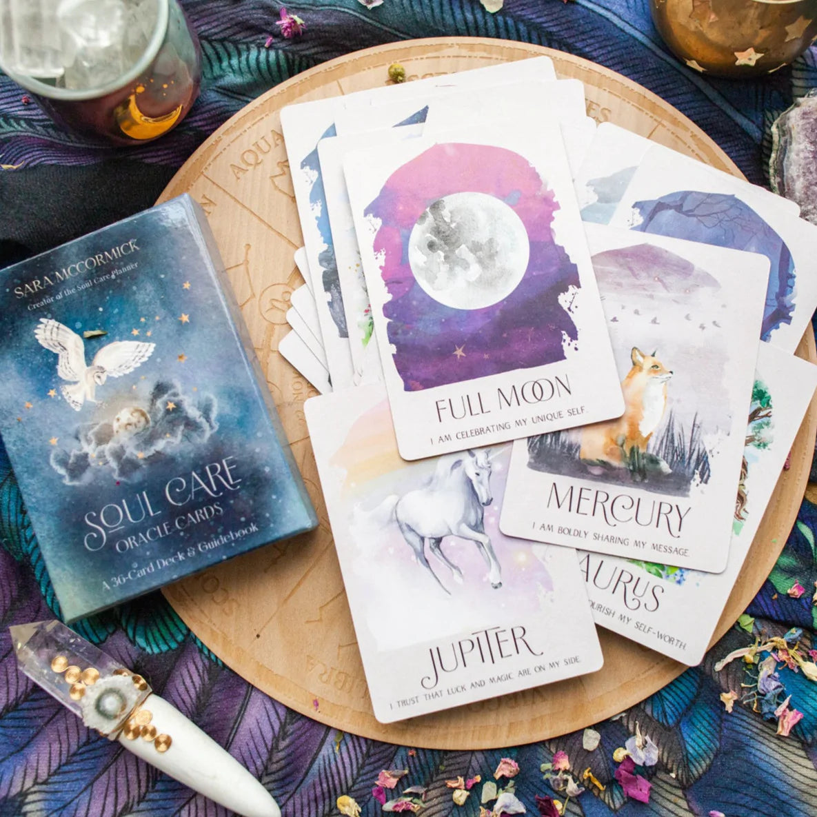 The Soul Care Oracle deck is your guide. With 36 cards based on the cosmos, including the planets, moon phases, seasons, zodiac signs, and elements, the Soul Care Oracle deck will guide you home back to yourself. This deck was created entirely by Sara McCormick, the astrologer behind Bella deLuna Astrology. Perfect for pulling a daily card or any oracle or tarot card spread you can dream up.