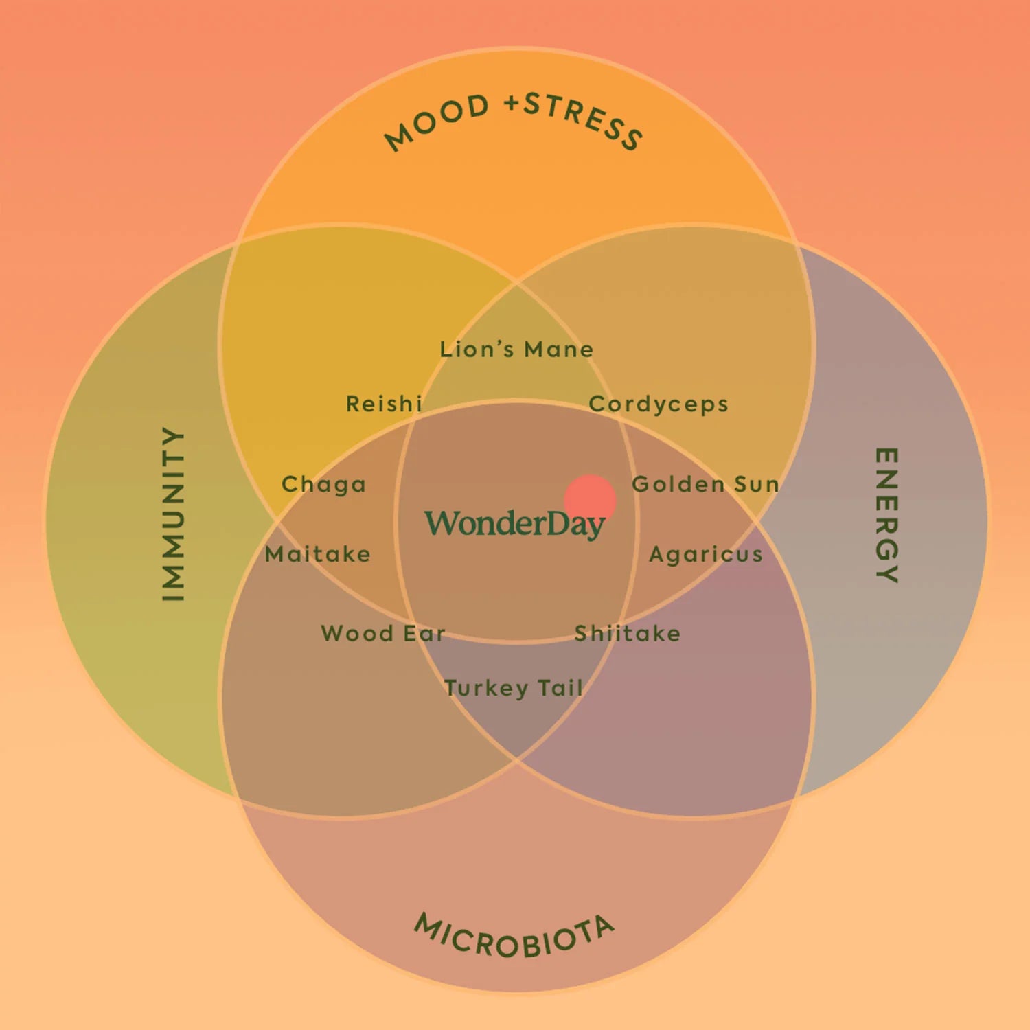 Lion’s Mane† , Cordyceps†, Reishi Mushroom†, Chaga†, Maitake Mushroom†, Turkey Tail†, Shiitake†, Wood Ear†, White Button†, Royal Sun†