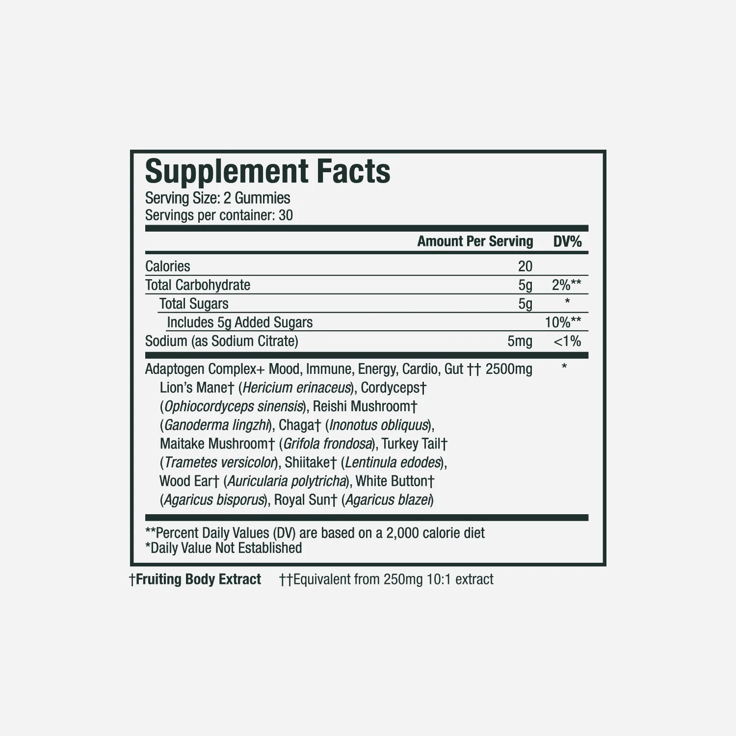 Low-sugar, mushroom gummies to support mood, stress, energy and immunity. Each serving is a mushroom POWERHOUSE with 10 functional mushrooms. 60 gummies per pouch. 30-day supply.