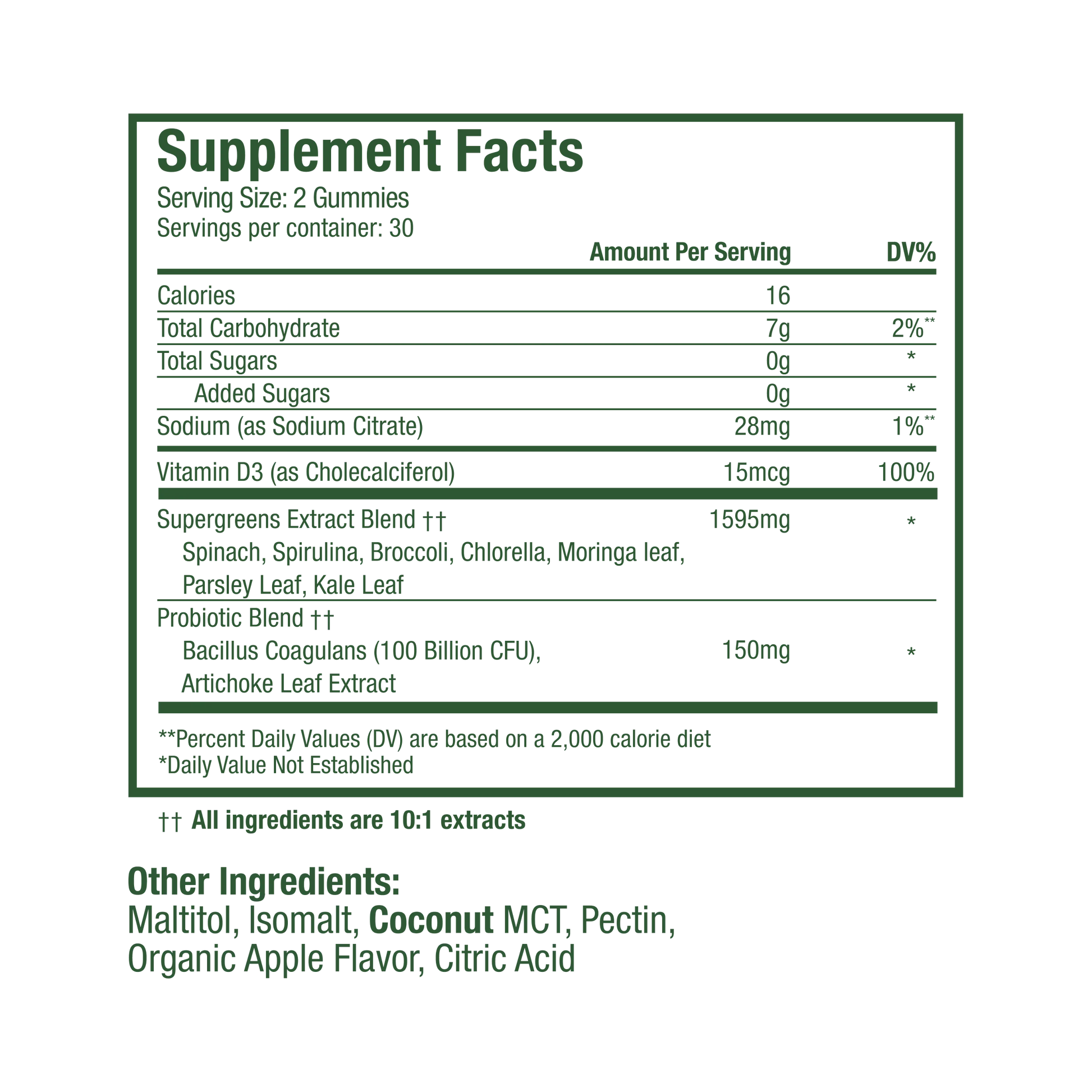Supergreens Extract Blend (1595mg): Spinach, Spirulina, Broccoli, Chlorella, Moringa Leaf, Parsley Leaf, Kale Leaf, Vitamin D3 (15mcg). Probiotic Blend (150mg): Bacillus Coagulans (100 Billion CFU), Artichoke Leaf Blend (Prebiotic). ;